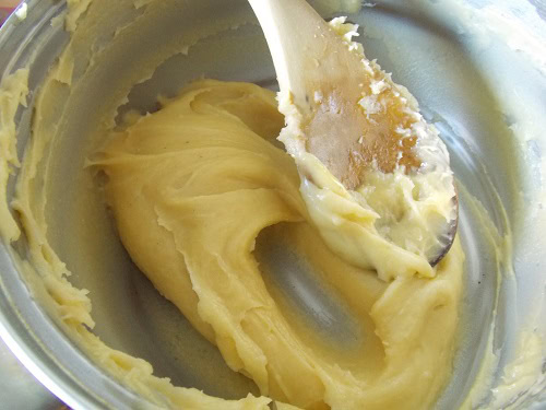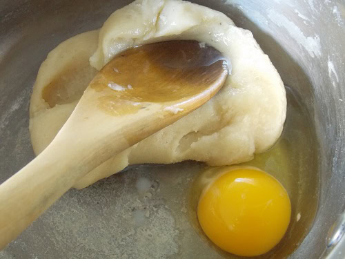 - Ajouter un à un les oeufs dans la pate en la travaillant bien avant d'ajouter le prochain oeuf en la pressant sur la paroi pour faire entrer l'air, la pate doit etre molle mais non liquide.