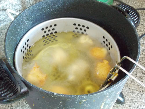 - Faire tomber la pâte par petites cuillères à café en s'aidant d'une deuxième cuillère (ne pas trop en mettre dans la friteuse).