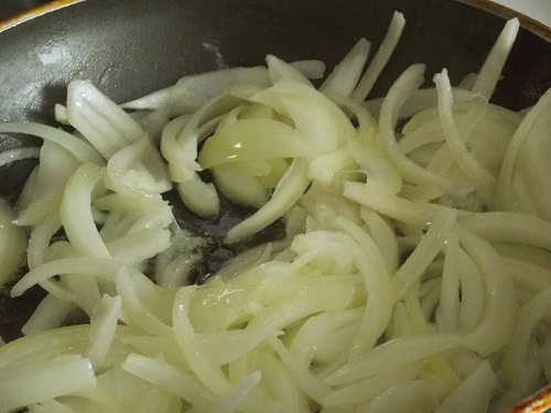 - Faire fondre 30 g de beurre et huile dans une poêle et y faire légèrement colorer les oignons émincés à feu doux. Les égoutter dans une passoire.
