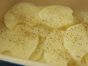 - Dans un plat à gratin beurré, disposer une couche de pommes de terre, saler, poivrer.