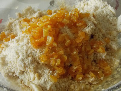 - Ajouter le mélange oeuf-cassonade ainsi que les oranges confits coupées en petit morceaux. Ramasser la pâte en boule sans trop la travailler.