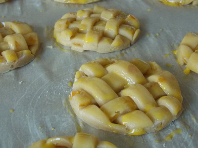 - Badigeonner la surface de sables d'un mélange jaune d'oeuf et fleur d'oranger. J'ai aussi saupoudré la surface de vanille au sucre de canne.