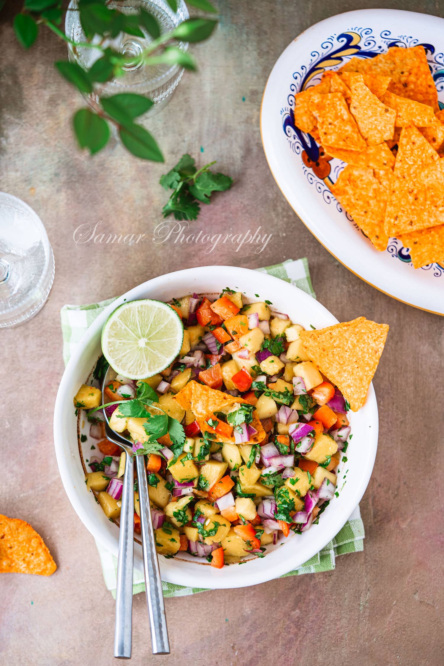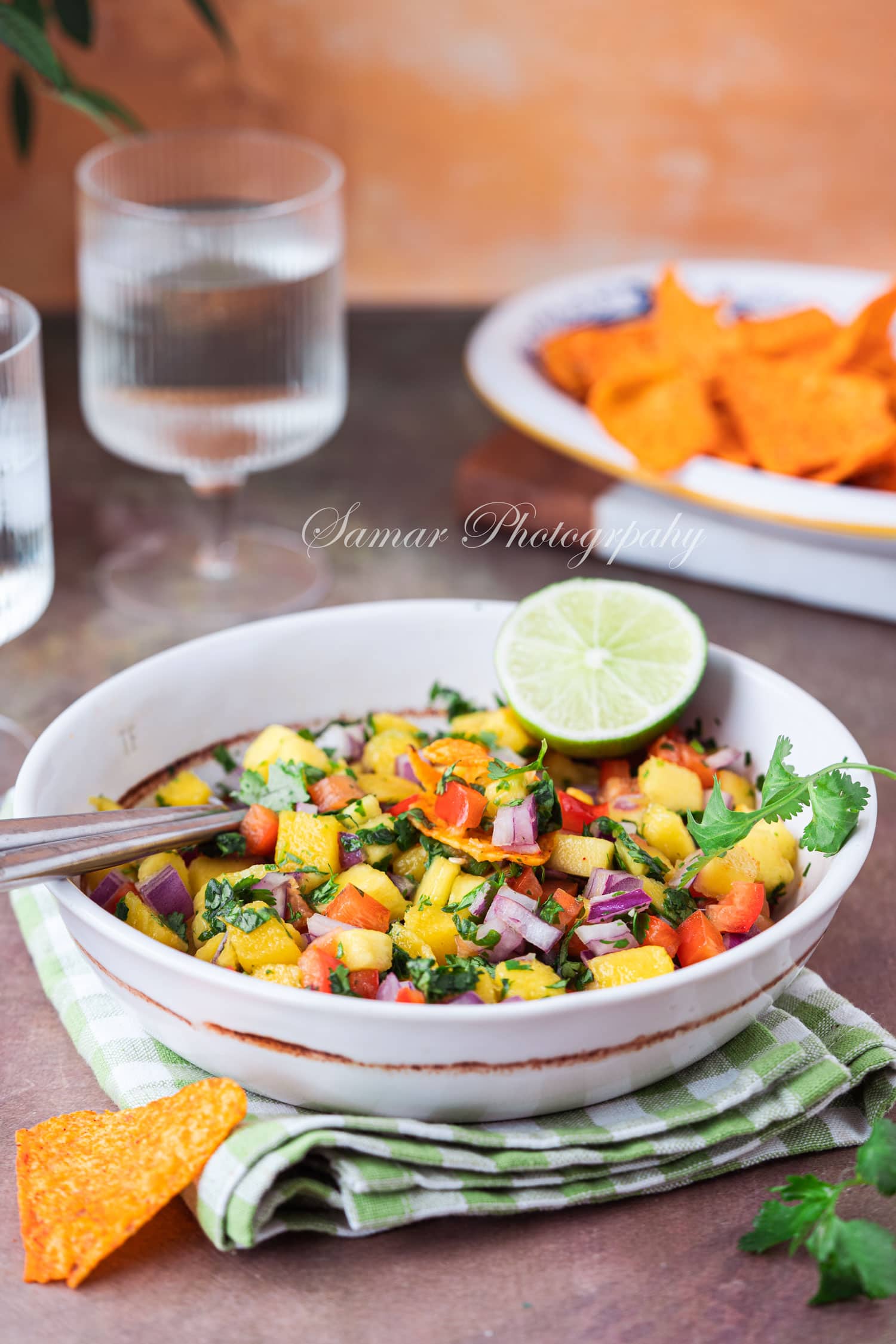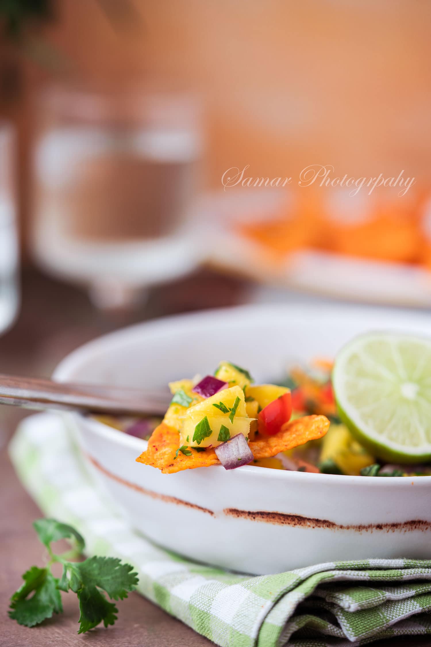 - Mélangez le jus de citron vert, la coriandre, le cumin et versez sur la salsa.
