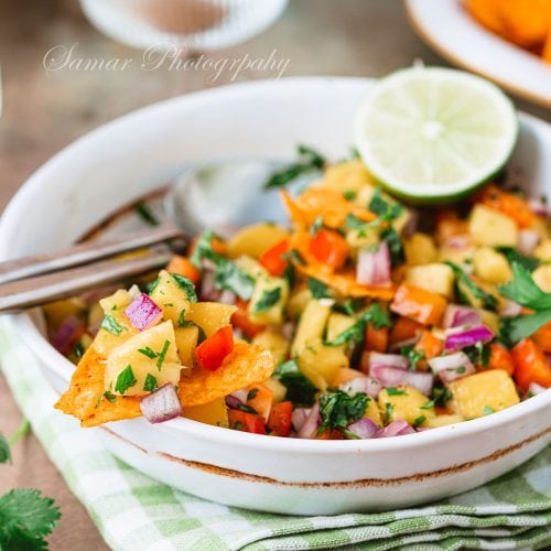 Cette recette de salsa à la mangue est un apéritif parfait. Je l’adore nature avec des chips tortillas, et c’est aussi une excellente façon de relever le guacamole. Versez-en un peu dans votre prochain bol de guacamole pour une sauce raffinée !