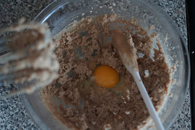 Dans un saladier, commencez par mélanger le beurre et les sucres. Puis, crémez à l’aide d’un batteur jusqu’à obtenir une texture légère et pale (environ 4 minutes). Incorporez ensuite l’oeuf.