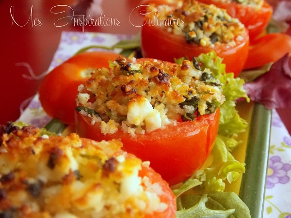 Une entrée rapide au bon goût de feta j’ai utilisé des tomates cocktails elles sont de tailles moyennes idéales pour accompagner une salade ou des grillades. Des tomates farcies aux épinards, oignons rouges, chapelure et pignons pour le coté croustillant ainsi que le fromage feta.