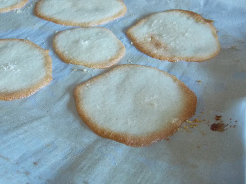 - Quand le bord des tuiles commence a être dorée (environ 5-10 minute) décoller de la plaque avec une spatule et déposer sur un rouleau à pâtisserie afin que les tuiles prennent la forme arrondie. Laisser refroidir.