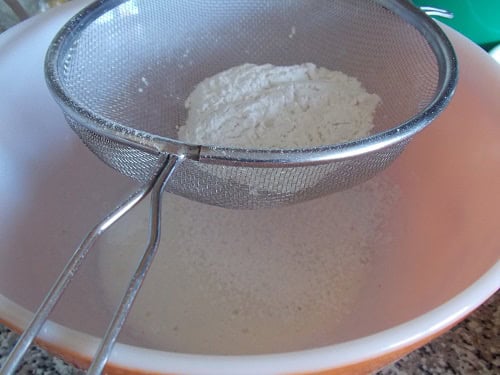 Ajoutez la farine tamisée en pluie, tout en continuant de fouetter pour éviter les grumeaux.
