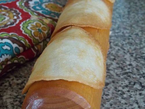 Déposez-les immédiatement sur un rouleau à pâtisserie, une bouteille ou une forme arrondie pour leur donner la courbure caractéristique.