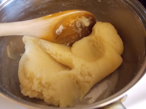 - Ajouter la farine et melanger avec une spatule en bois jusqu’à ce que se forme une pâte homogène et lisse qui se décolle des parois de la casserole. Continuer a mélanger durant 3 min. Retirer du feu et placer la pate dans un récipient.