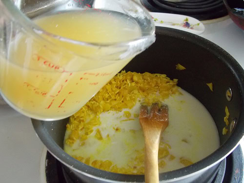 - Verser le lait de coco et le bouillon de poulet. Réduire à feux doux, ajouter les crevettes si elle ne sont pas cuite et couvrir la casserole.