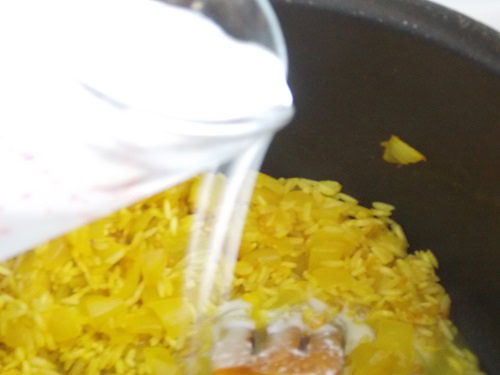 Ajoutez le riz ainsi que le ghee restant (1 c-a-soupe). Poursuivez la cuisson quelques minutes jusqu’à ce que le riz prenne une belle coloration.