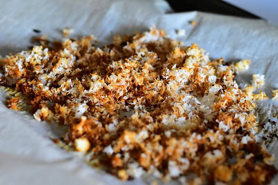 - Verser la noix de coco sur une plaque recouverte de papier sulfurisé et enfourner dans un four préchauffé à 150 C jusqu’à ce que la noix de coco prenne une belle couleur dorée. Surveiller en mélangeant de temps en temps.