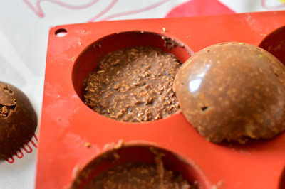 Pour ma part je n’avais pas de petits moules j’ai donc pris mes moules en forme de demi-sphère ce qui m’a donné 4 rochers pralinés. On peut accompagner ces délicieuses truffes façon Ferrero Rochers ® d’un bon chocolat chaud comme l’ont fait mes filles un pur régal pour les papilles. La texture est très proche des Ferrero, j’ai apporté une petite modification en remplaçant la pâte de noisette par du chocolat palinoise.