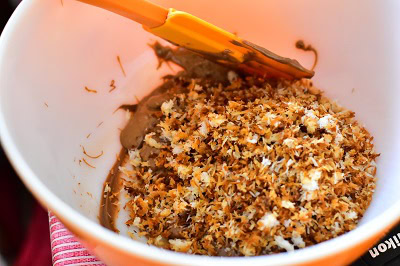 - Lisser a l'aide d'une spatule le chocolat et ajouter la pâte a tartiner (pralinoise pour moi) ainsi que le praline et la noix de coco caramélisée.