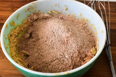 Ajoutez progressivement le mélange farine-cacao-levure aux ingrédients liquides en utilisant une spatule (Maryse).