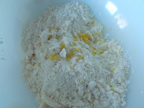- Ajouter le beurre coupe en petit des et sabler des bouts des doigts.