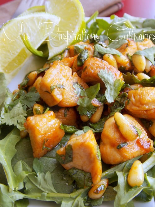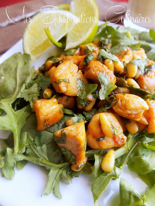 Mmmm !!! Cette salade me donne terriblement faim 🙂 Le poulet j’adore (tu le sais !!!) et les cacahuètes… alors là, il ne faut même pas que je commence à en mettre un dans ma bouche après je ne sais plus m’arrêter lol Avec des pignons c’est parfait !!