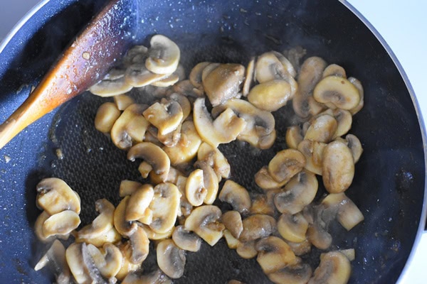 Ajouter dans la poêle les champignons émincées ( ajouter de l’huile d’olive si nécessaire ).