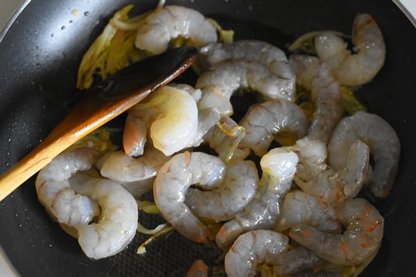Ajouter ensuite les crevettes et laisser cuire environ 1 minute jusqu’à obtenir une couleur opaque.