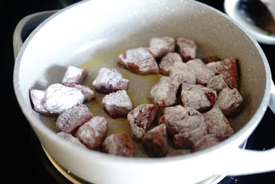 Dans une assiette creuse verser la farine et enrober les morceaux de viande.