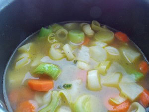 Je n’ai jamais fait avec des légumes autres que mon bouillon de pot au feu, et j’en ai fait un hier au soir donc ce soir soupe au tapioca, mon mari en raffole et vu que nous sommes mal fichus ça va réchauffer le corps et la gorge. Bises