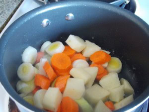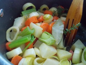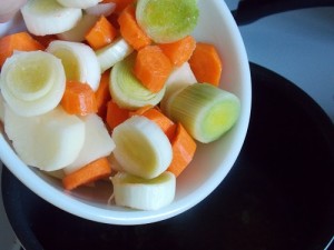 - Couper la pomme de terre en petit cube, les carottes et les poireaux en rondelle (prendre le blanc seulement).