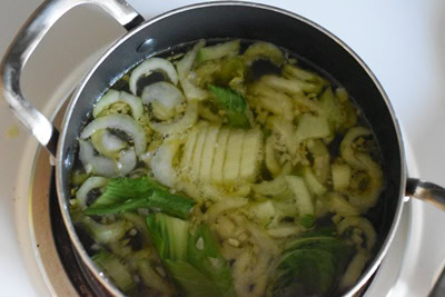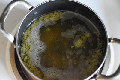 - Verser le bouillon et l'eau, porter à ébullition. Réduire le feu, couvrir la marmite et cuire environ 10 minutes.