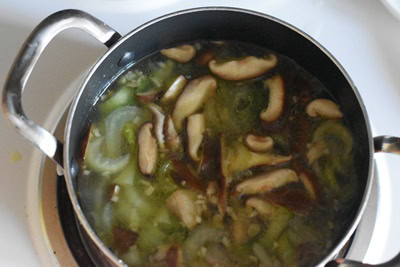 Versez le bouillon et l’eau puis portez à ébullition. Réduire le feu, couvrez la marmite et cuire environ 10 minutes.