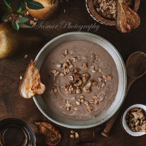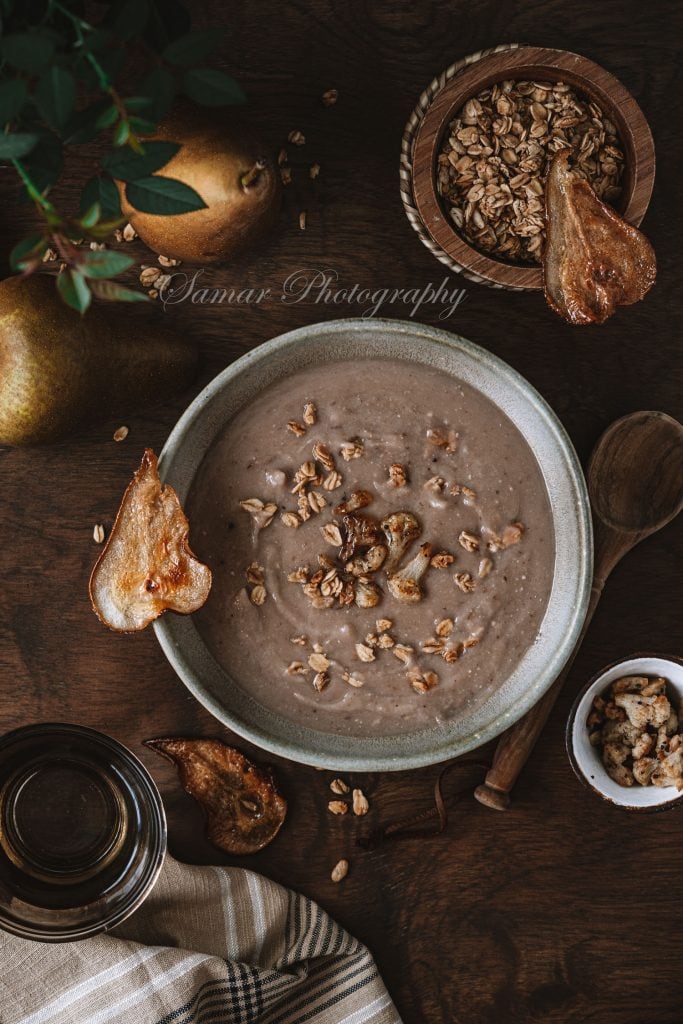 Les saveurs sont en parfaite harmonie : le crémeux du chou-fleur, la douceur de la poire et la saveur de la noisette. Le tout est assaisonné de thym frais, épaissi avec des flocons d’avoine et mélangé à du bouillon de légumes et des haricots blancs pour plus de protéines.