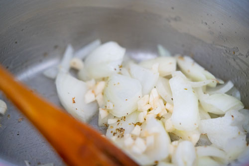 - Faites sauter l’oignon, l’ail et les épices dans une marmite.