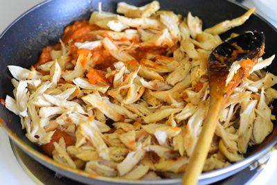 - Remettre la sauce dans la poêle et ajouter le poulet cuire le tout en mélangeant durant 5 minutes a feu moyen (le poulet est déjà cuit).