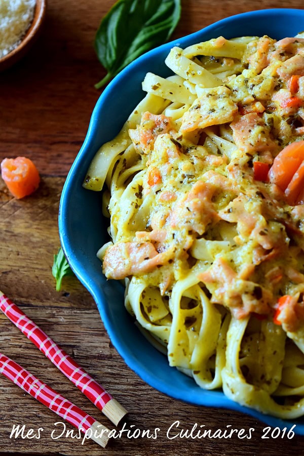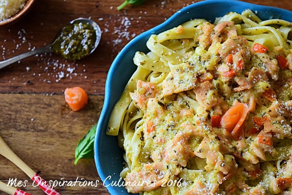 Pour cette recette de pâtes au saumon j’ai préparé une sauce Alfredo, une délicieuse onctueuse et riche sauce italienne. Elle est à base de crème liquide et fromage Romano et parmesan avec un soupçon de poivre blanc et de noix de muscade. J’ai aussi ajouté du poivron rouge cela reste facultatif mais c’est tellement bon et sans oublier du pesto vert fait maison pour ma part.