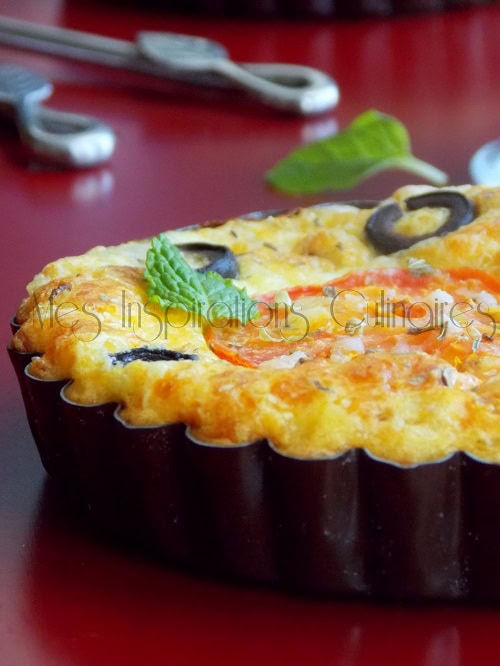 - Verser la préparation sur la tarte, décorer de rondelles de tomates et d'olives noires.
