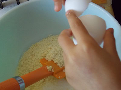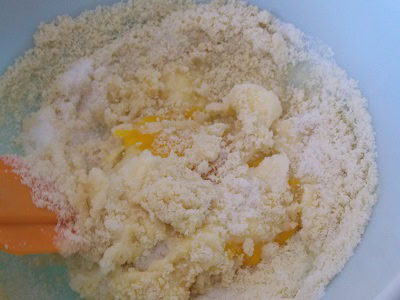 - Mélanger à la maryse l'oeuf, la poudre d'amande, sucre et le beurre légèrement fondu.