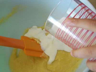 - Verser la crème et mélanger (travailler la pâte le moins possible afin que la crème d'amande ne gonfle pas durant la cuisson).