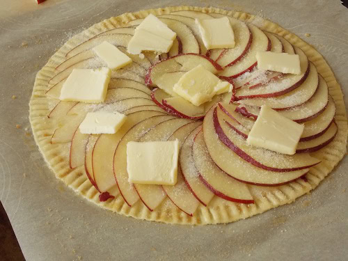 - Saupoudrer la surface de sucre et disposer des parcelles de beurre sur toute la surface des pommes.