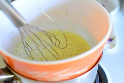 - Faire épaissir ce mélange au bain-marie (le saladier ne doit pas toucher l'eau) tout en mélangeant au fouet constamment.