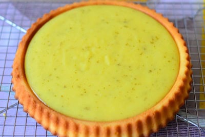 - Garnir la tarte génoise de la crème au citron vert et menthe, laisser refroidir avant de mettre au frais environ 2 à 3 heures.