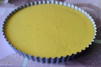 - Verser dans le moule à tarte (j'ai utilisé un moule à tarte de 24 cm il me restait un peu de pâte que j'ai fait cuire dans un petit moule à savarin).