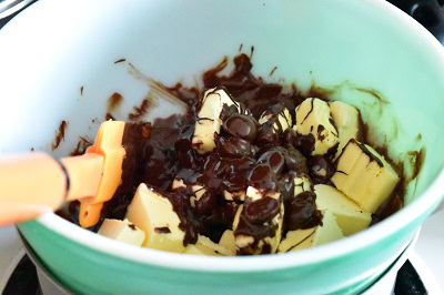 - Faire fondre le chocolat ainsi que le beurre (au bain-marie pour moi), lisser la préparation. Réserver.