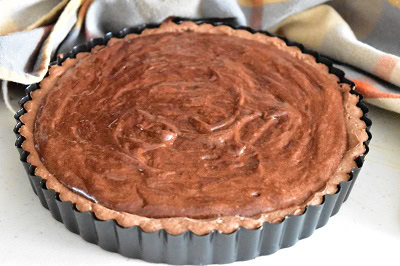 - Étaler la pâte sablée au cacao, garnir le moule, piquer le fond a la fourchette. Couvrir d'un papier cuisson et de légumes secs. Cuire durant 10 minutes. Retirer le papier ainsi que les légumes secs et continuer la cuisson a blanc durant 5-10 minutes.