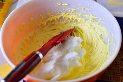 - Incorporer délicatement les blancs à la préparation précédente à l'aide d'une spatule en 3 fois afin de ne pas casser les oeufs.