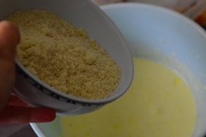 - Ajouter le chocolat blanc et l'incorporer à la spatule ainsi que la poudre d'amande.