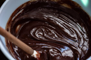 3. Faire fondre au bain-marie le chocolat noir. Retirer du bain marie et verser le mélange crème liquide-miel tout en remuant avec un fouet (ne pas fouetter juste remuer) sur le chocolat jusqu’à ce qu’elle devienne onctueuse et brillante.
