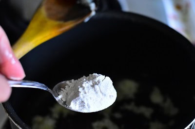 Ajouter le farine et mélanger avec une cuillère en bois jusqu’à former un roux.