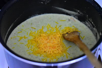 - Ajouter le fromage Cheddar et assaisonner la soupe de sel et poivre noir au goût.