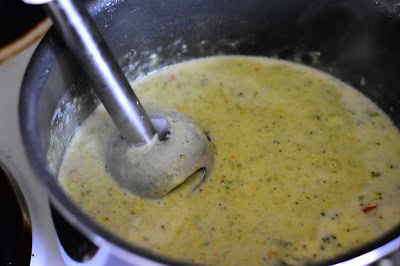 - Mixer le veloute de brocoli en utilisant un mixeur plongeant ou d’écraser (cette étape est facultatif car au Panera Bread™ on garde les légumes entier).