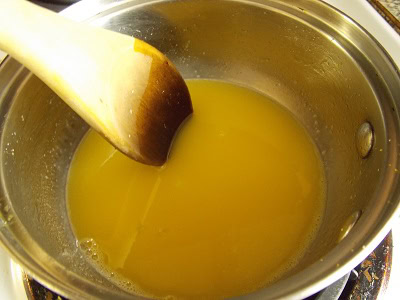 Dans une casserole verser le jus de citron (je remplace toujours le 1/3 de jus de citron par du jus d’orange pour moins d’acidité), le sucre ainsi que le zeste de citron.