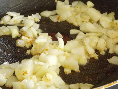 - In the same pan, add the chopped onion and minced garlic. Cook, stirring frequently, until the onion becomes soft and translucent.